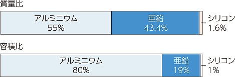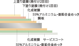 亜鉛の犠牲防食作用(※1)とアルミニウムの不動態保護作用(※2)を最大限に機能させるめっき層の組成で、非常に優れた耐食性を発揮します。