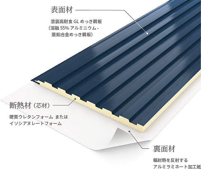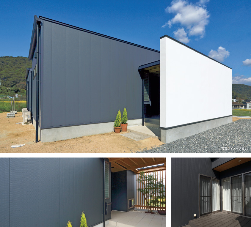 表面材と裏面材に断熱材を一体成型した、高機能金属製外壁材です。