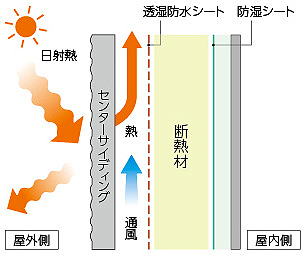 夏季は通気層の通風により、遮熱効果を得ることができ、屋内の冷暖房効果の向上に寄与します。