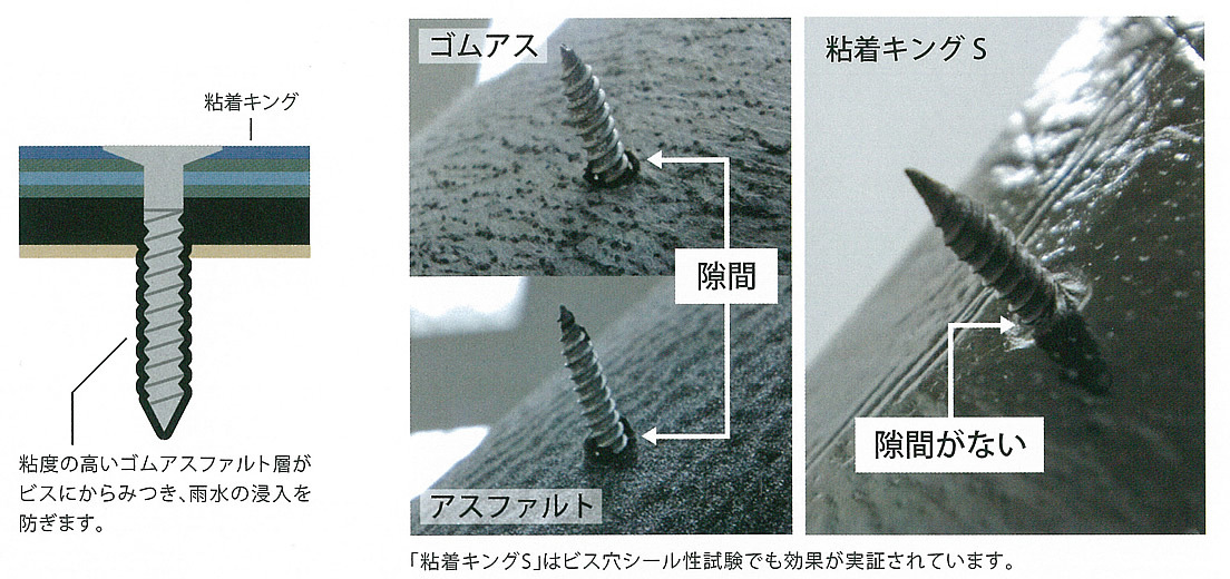「粘着キングS」なら粘度の高いゴムアスファルトを使用し、打ちこんだビスに、ゴムアスファルトのブチル成分がしっかりからみつき、さらに熱でゴムアスファルトが収縮するため、抜群の釘穴止水性能を発揮します。