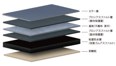 「粘着キングS」は改質ゴムアスファルトという長期的に硬化しにくい素材を使い、従来の3倍近く耐久性を向上させた素材を採用しています。