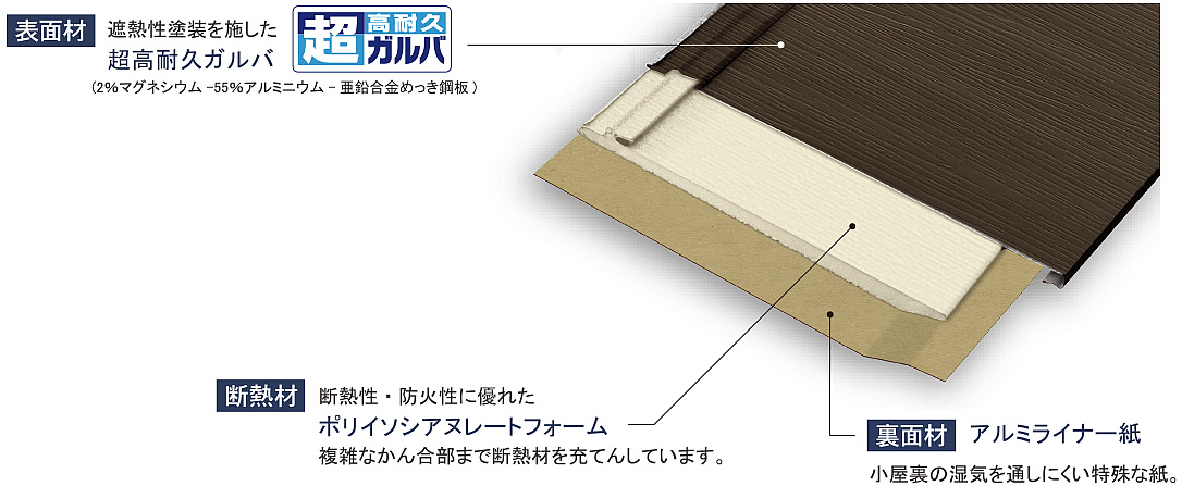 遮熱性鋼板と断熱材の相乗効果で優れた断熱性能を発揮。