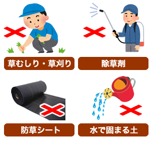 草むしりや草刈り作業、除草剤や防草シートでの対策、水で固める土処理などの、様々な雑草対策がありますが、雑草の生える力は非常に強く、雑草対策を完全には解決は出来ていないのが現状です。