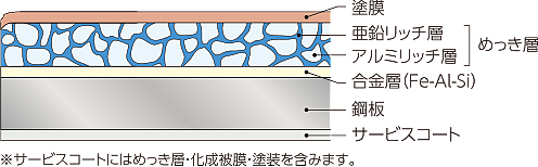 亜鉛の犠牲防食作用(※1)とアルミニウムの不動態保護作用(※2)を最大限に機能させるめっき層の組成で、非常に優れた耐食性を発揮します。