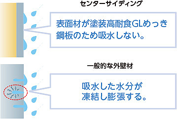 塗装高耐食GLめっき鋼板を使用しているセンターサイディングは、水分を吸水せず、凍害の心配がありません。
