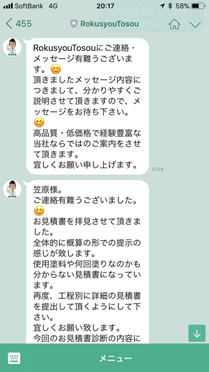 LINEで当社アカウントに送って頂きました、ご相談やお問い合せ、お見積相談に迅速にご回答やご案内メッセージや情報を送らせていただきます。
