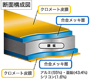 以前の鋼板屋根材は、鋼板に化成処理をし亜鉛メッキを施し、下塗り・上塗り塗装をした製品が主でございました。