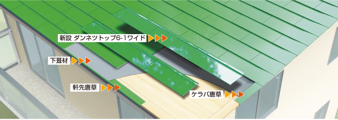 遮音材・断熱材として働く既存の屋根材と新設のダンネツトップ6-1ワイドとの二重構造により、機能性・耐久性ともにアップする安心・安全な工法です!