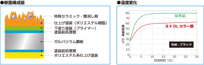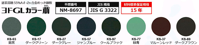 ヨドGLカラー萠(きざし)は、塗装用基材にガリバリウム鋼板を採用し、裏面塗装は対スベリ性を考慮したサービスコート仕上げです。塗膜意匠はマット調仕上げで、耐食性&耐候性ともに向上し、落ち着いた雰囲気に仕上がります。膿色は艶移りを低く抑えます。